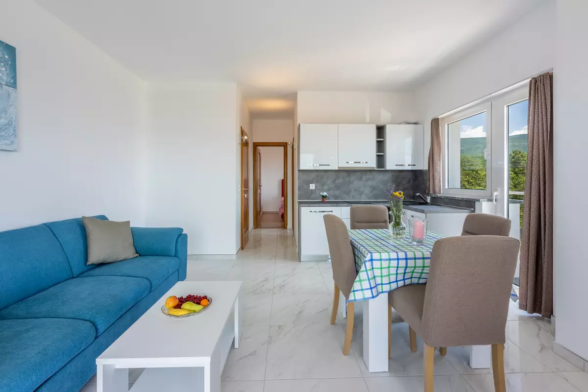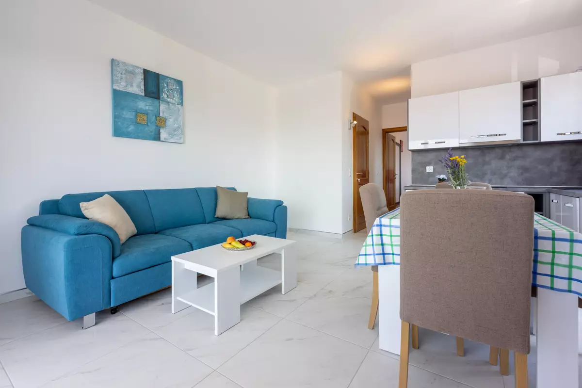 Wohn/Esszimmer und Küche sind ein Raum, Schlafcouch für zwei Personen, Balkon, Meerblick, Fliesen, Sat-TV
