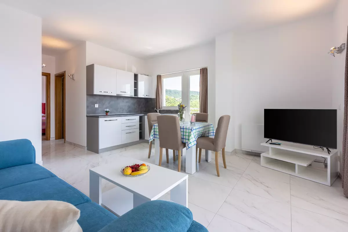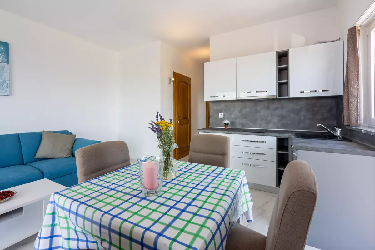 Die Wohnung liegt im 2. Obergeschoß, und besteht aus einem geräumigen Wohn-/Esszimmer mit Küche im selben Raum, einem Schlafzimmer und einem Badezimmer. In dieser Wohnung sind 2 Klimaanlagen vorhanden, eine im Wohnbereich und die zweite im Schlafzimmer. Vom Wohnbereich aus hat man einen direkten Zugang zu dem Balkon dieser Wohnung welcher über einen traumhaften Meerblick verfügt. Ein privater Parkplatz befindet sich auf dem Grundstück des Hauses und steht ko...