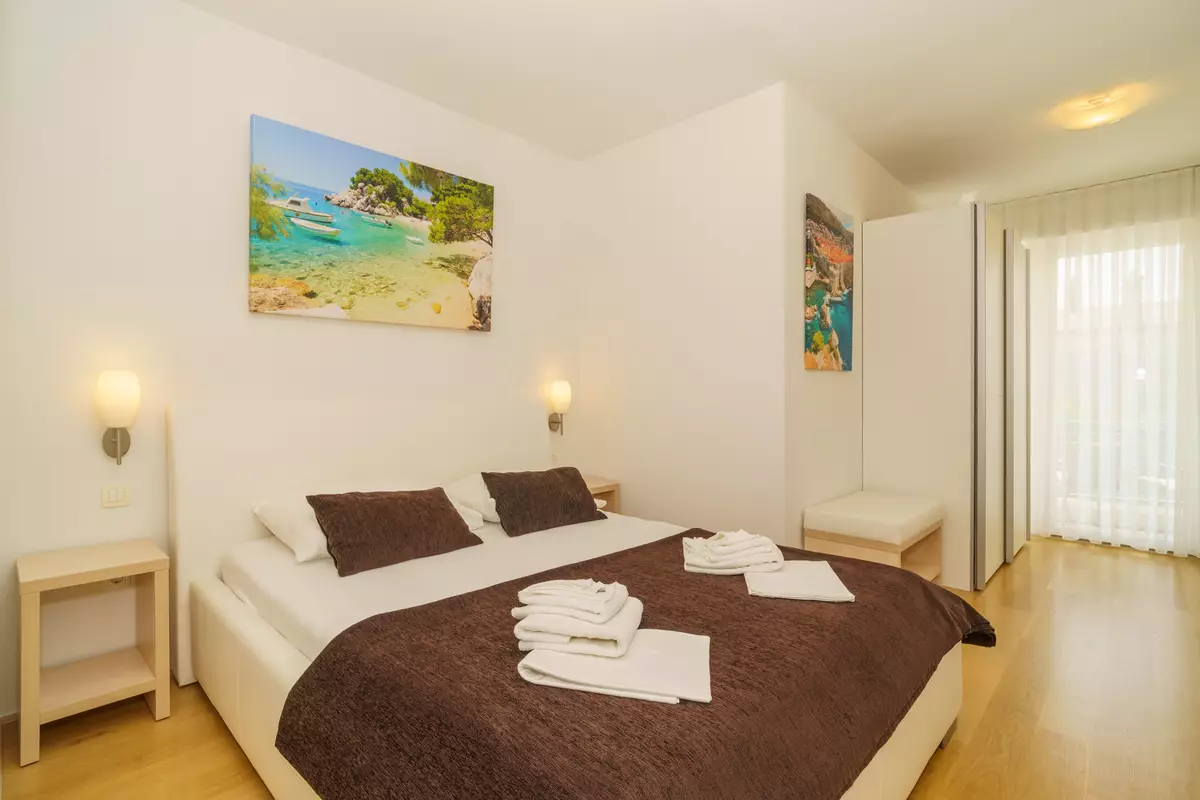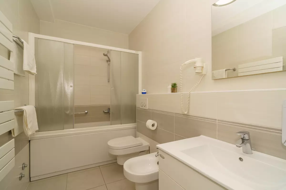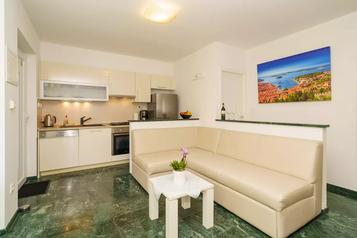 Ausstattung Wohnbereich Wohn/Esszimmer und Küche sind ein Raum, Terrasse, Meerblick, Fliesen, Sat-TV Küche Geschirr, Küchenhandtücher, Elektro/Gasherd kombiniert, Kochplatten: 4, Backröhre, Kühlschrank mit Gefrierfach, Filterkaffeemaschine, Wasserkocher, Toaster, Geschirrspülmaschine Schlafzimmer Doppelzimmer mit Doppelbett Doppelzimmer mit Doppelbett Badezimmer Bad mit WC, Badewanne separates WC Balkon & Terrasse eigener Balkon, teilw...